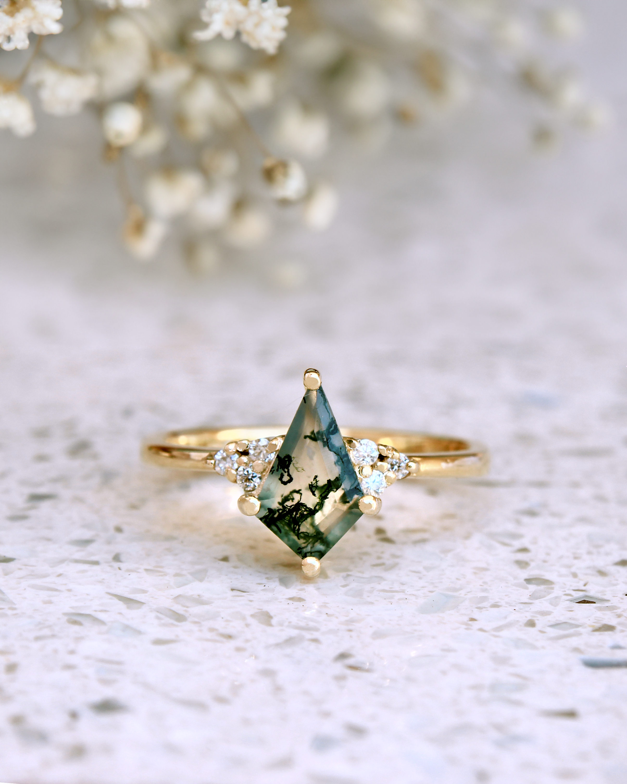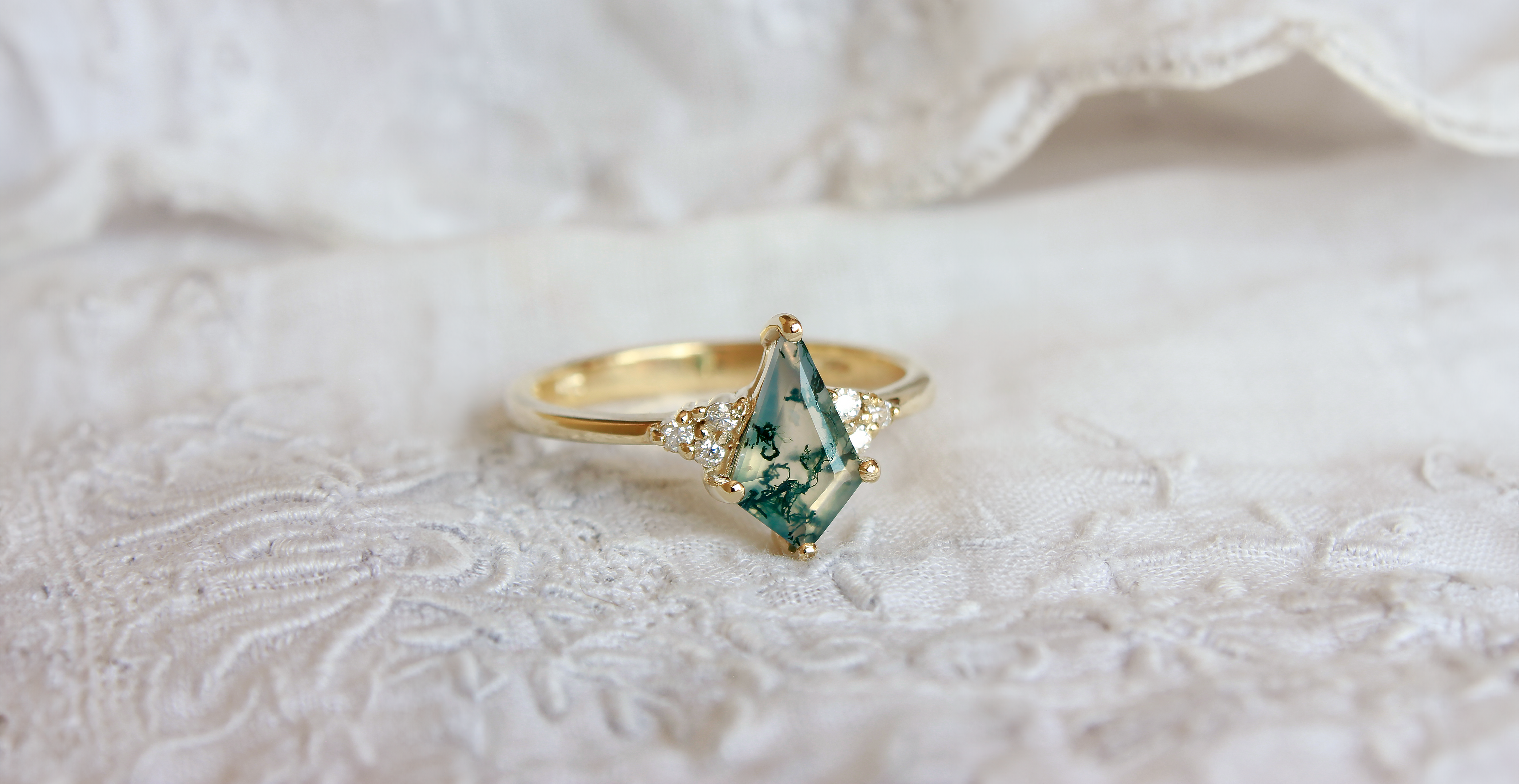 A breathtakingly gorgeous moss agate engagement ring with trio diamond detailing, featuring a stunning 10x6mm hand-cut gem with awe-inspiring natural inclusions - appropriate for both everyday wear and special engagements. Perfect for nature-lovers, fantasy fans and lovers of all that is unusual.