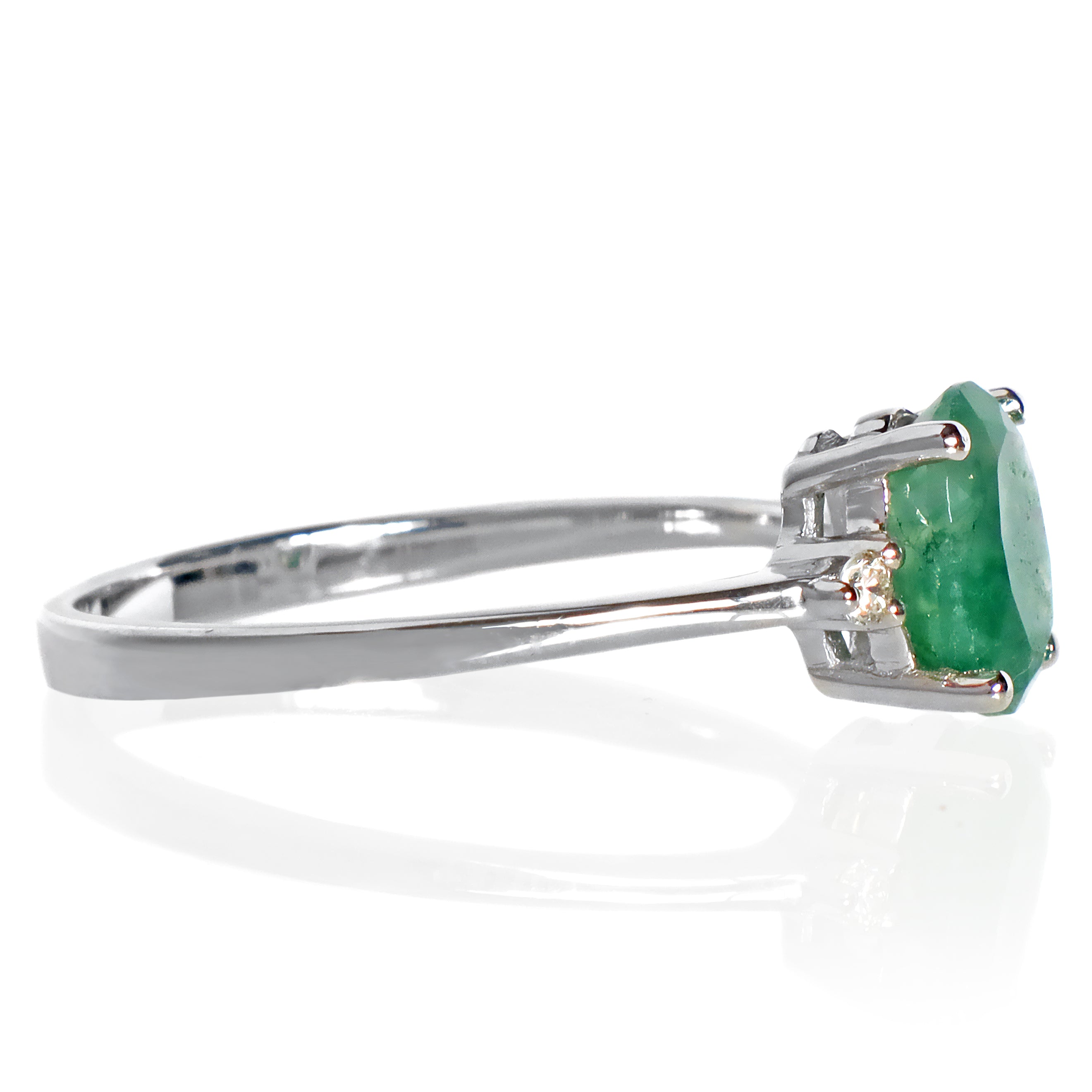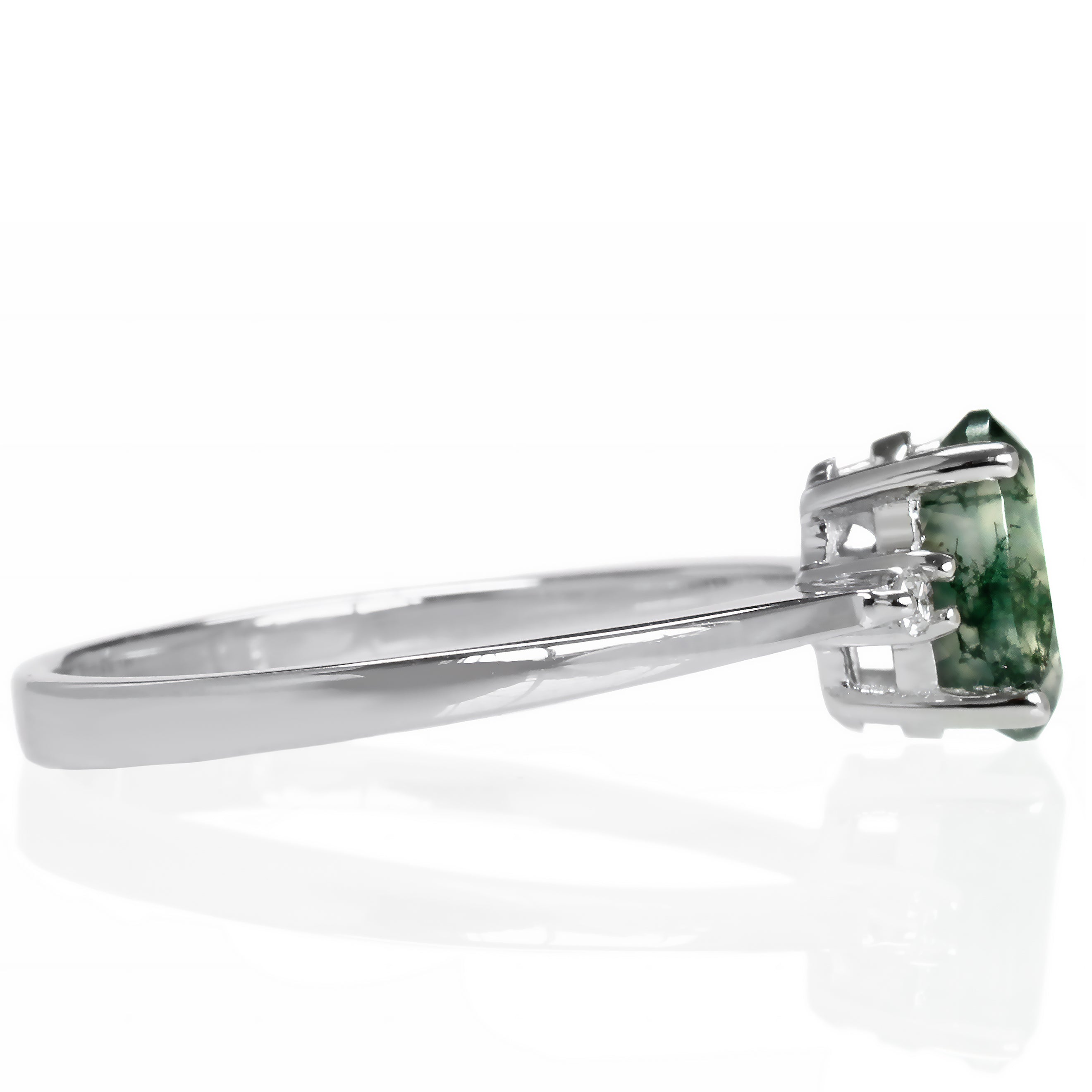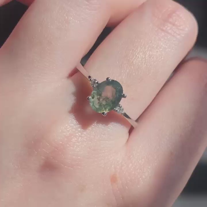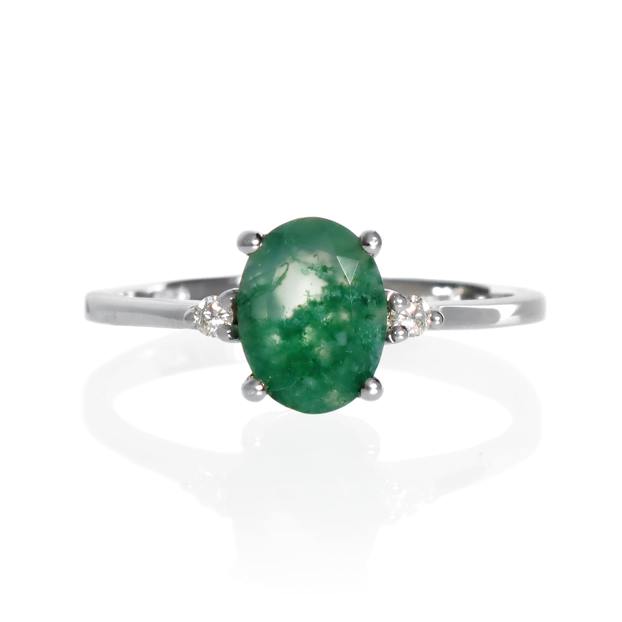 An elegant white gold ring with a stunning trio of 8x6mm moss agate and diamonds.