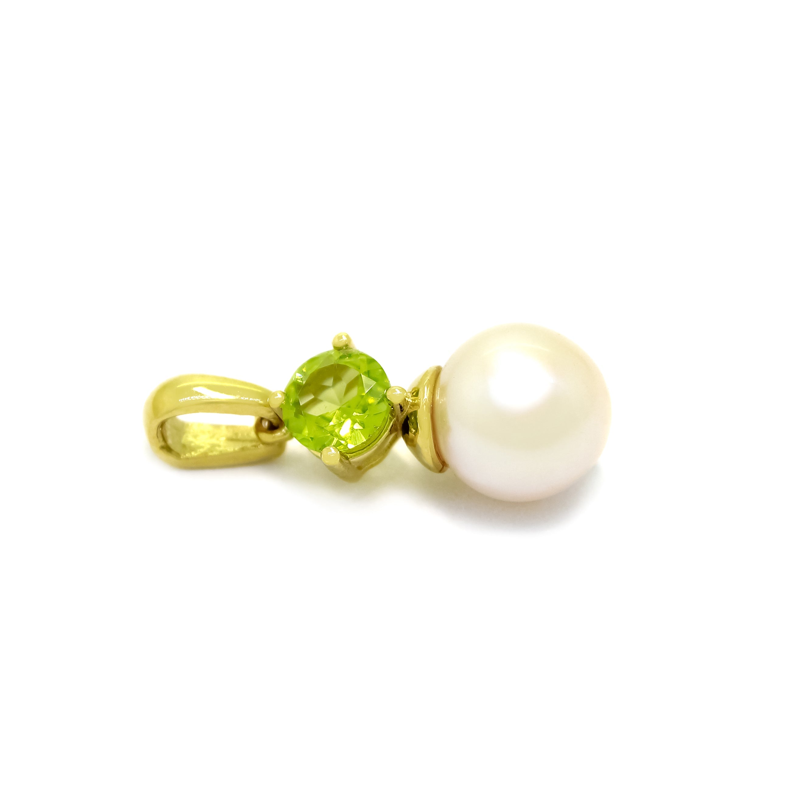 An elegant 7mm white pearl pendant adorned with a 5mm peridot jewel, for a sophisticated look. Chain not included.