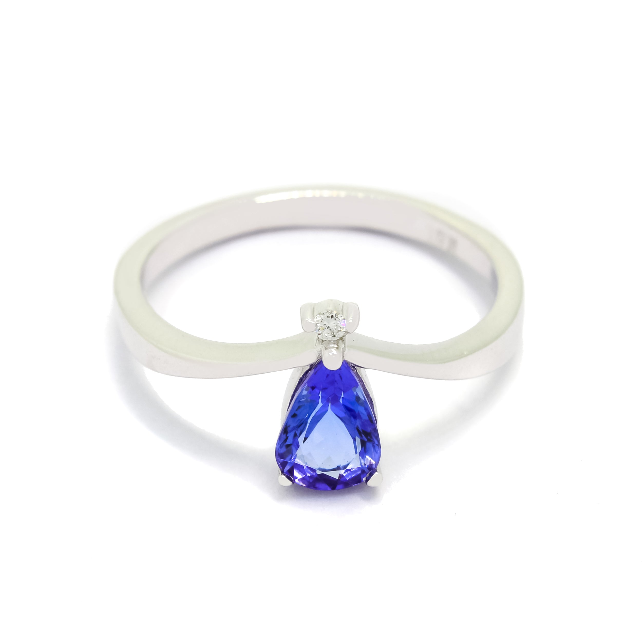 A delicate tanzanite teardrop ring with a single diamond accent.