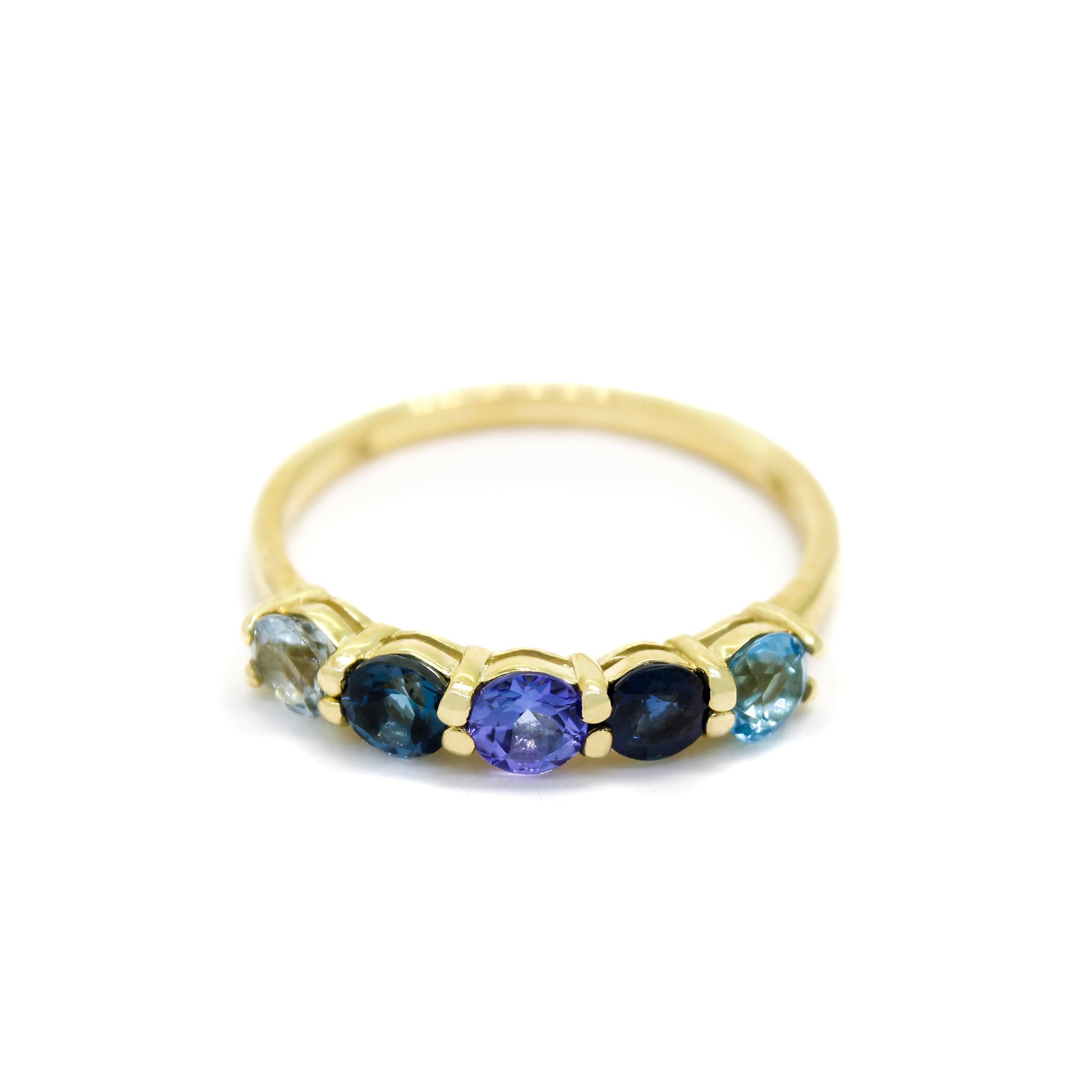 A stunning multi-jewelled ring made up of 5 4mm round-cut blue jewels - aquamarine, London Blue topaz, tanzanite, sapphire and blue topaz - for a an elegantly lavish look.