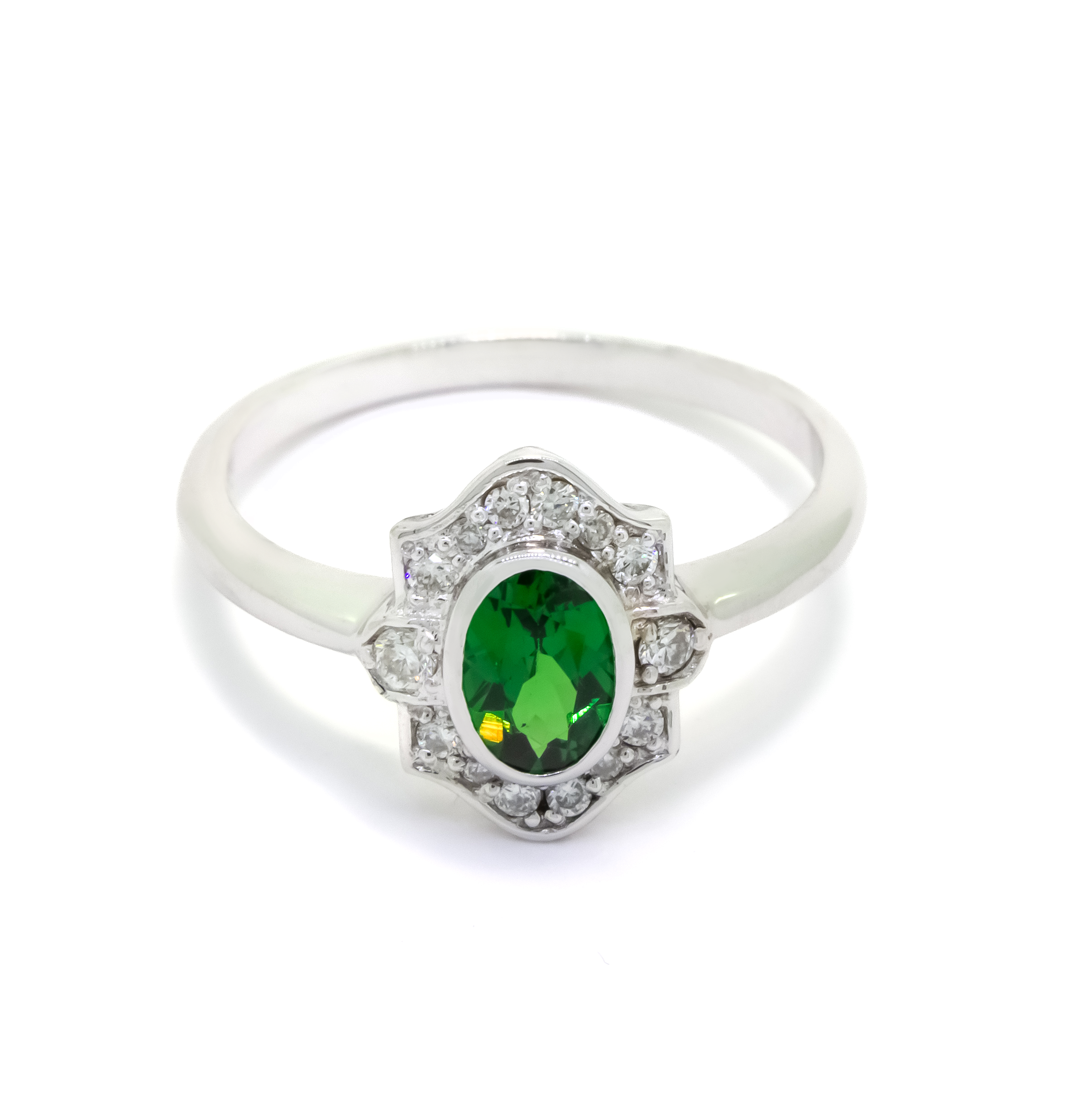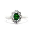 A stunning vintage styled tsavorite ring in solid 9k white gold and diamond detailing.