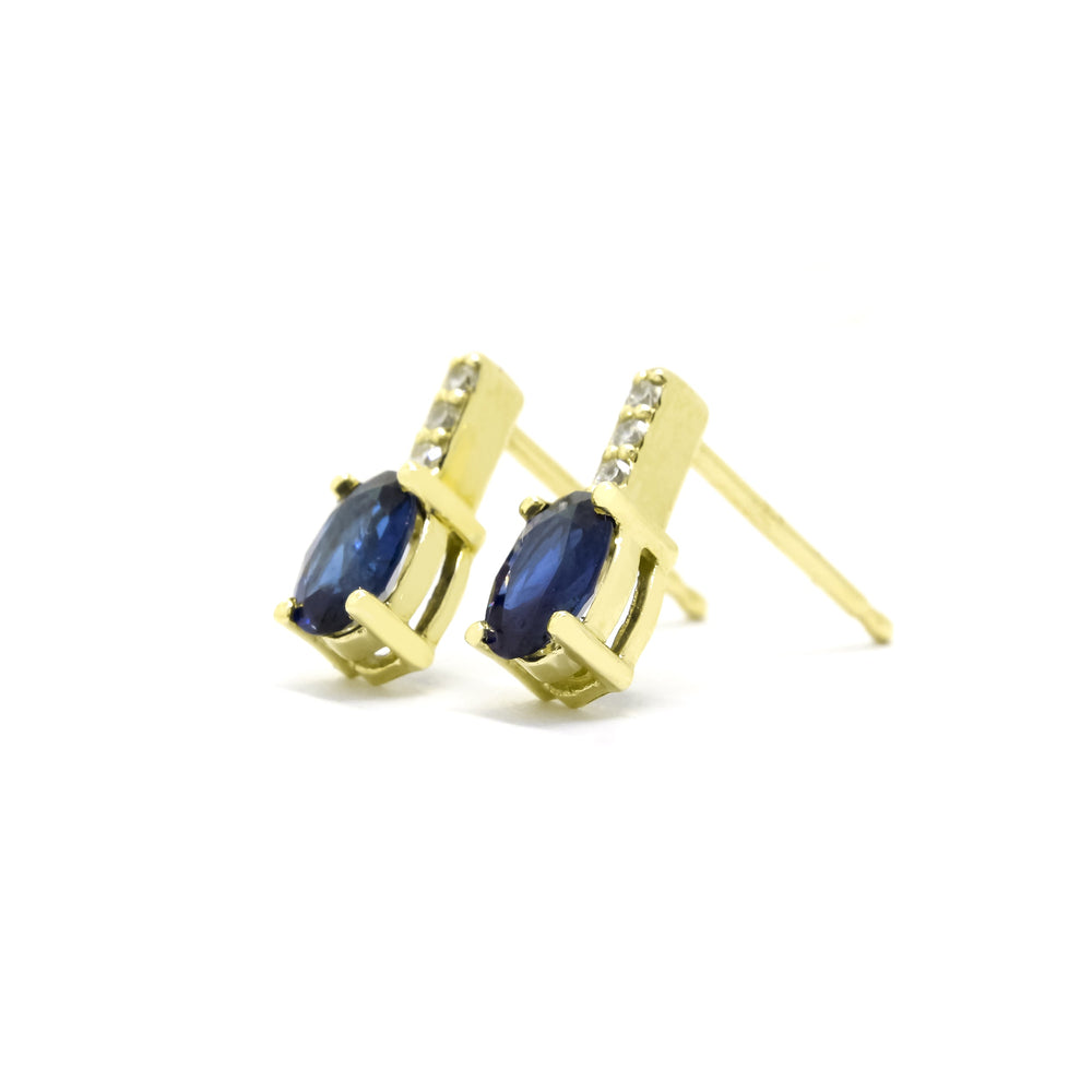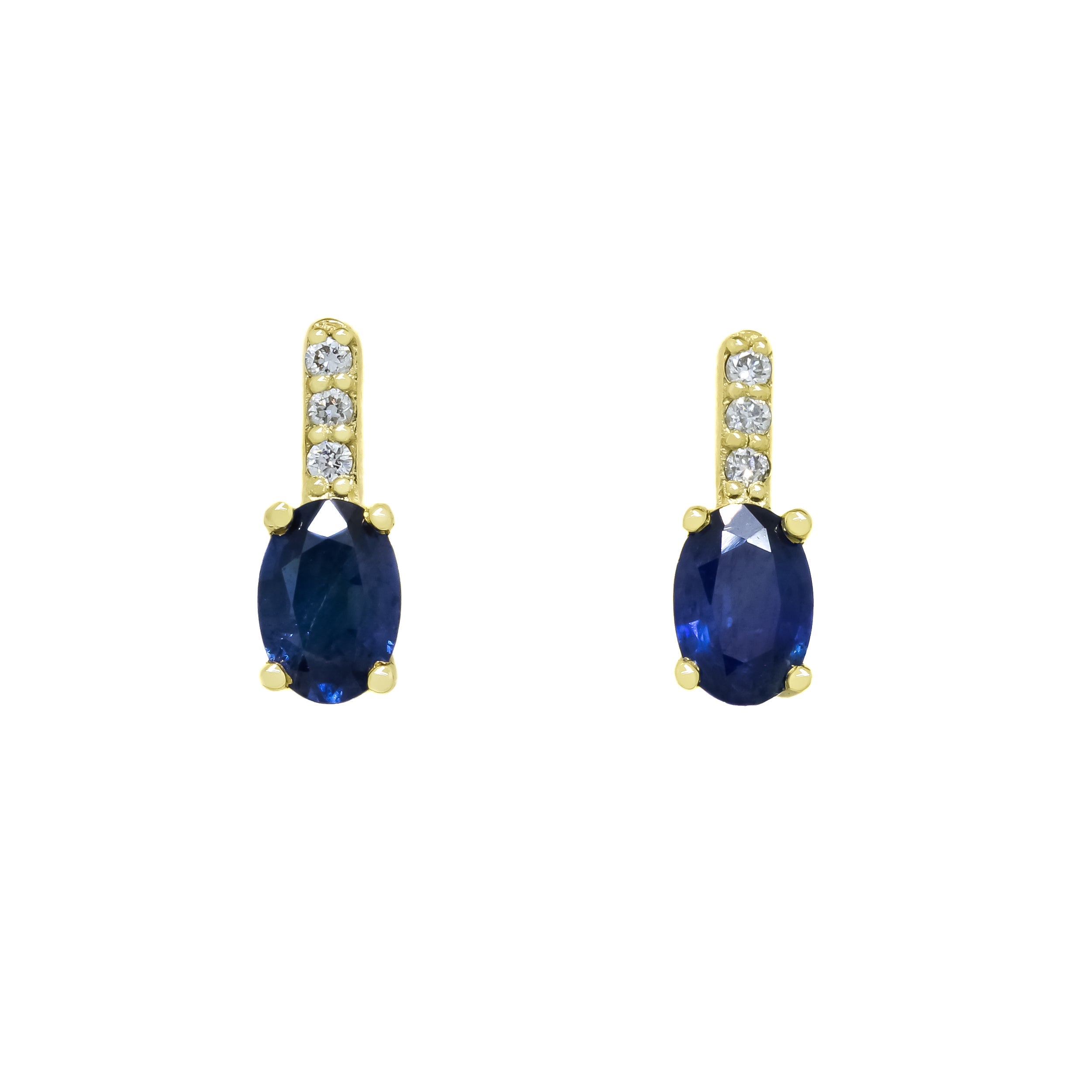 A pair of dainty yellow gold 6x4mm sapphire earrings with diamond trio detailing.