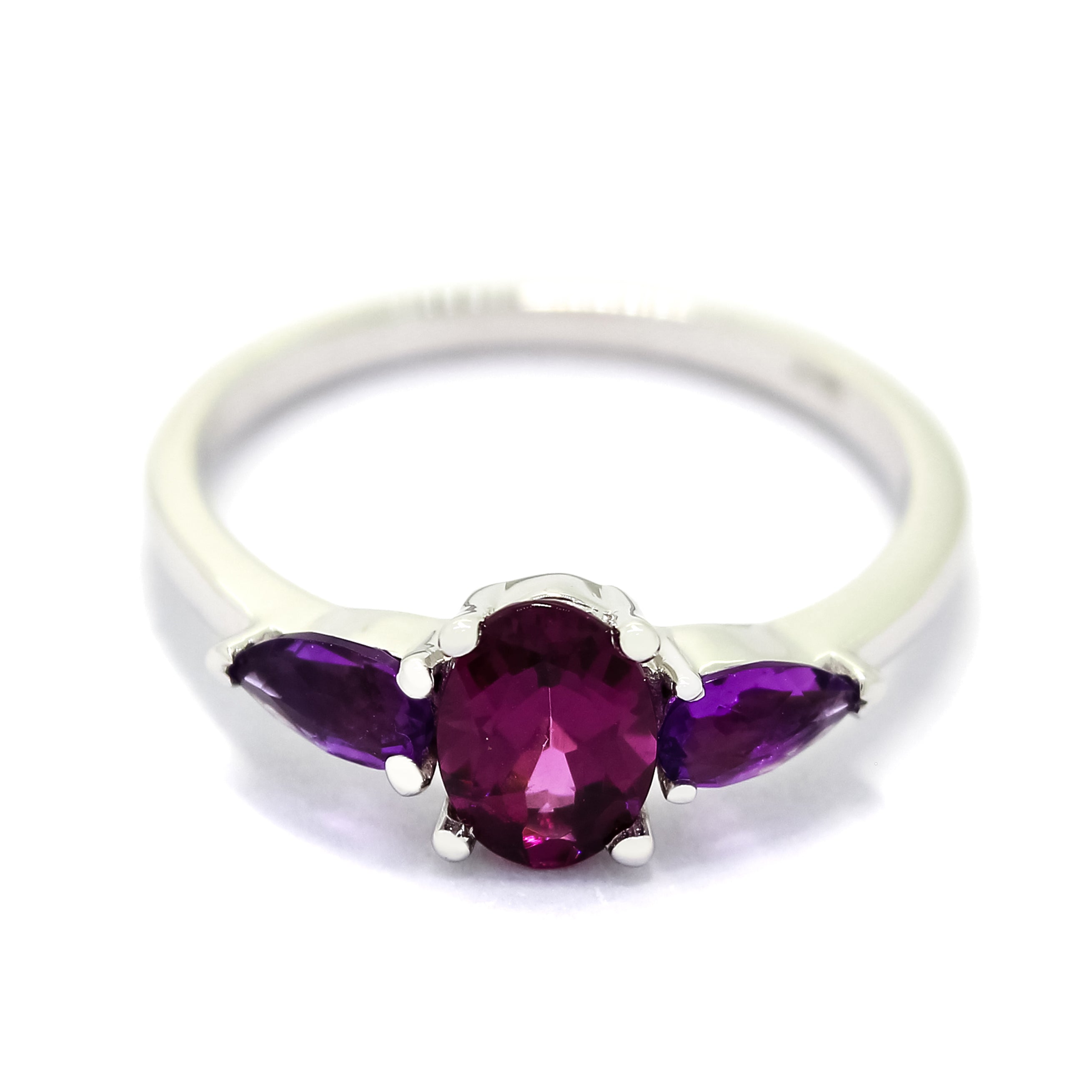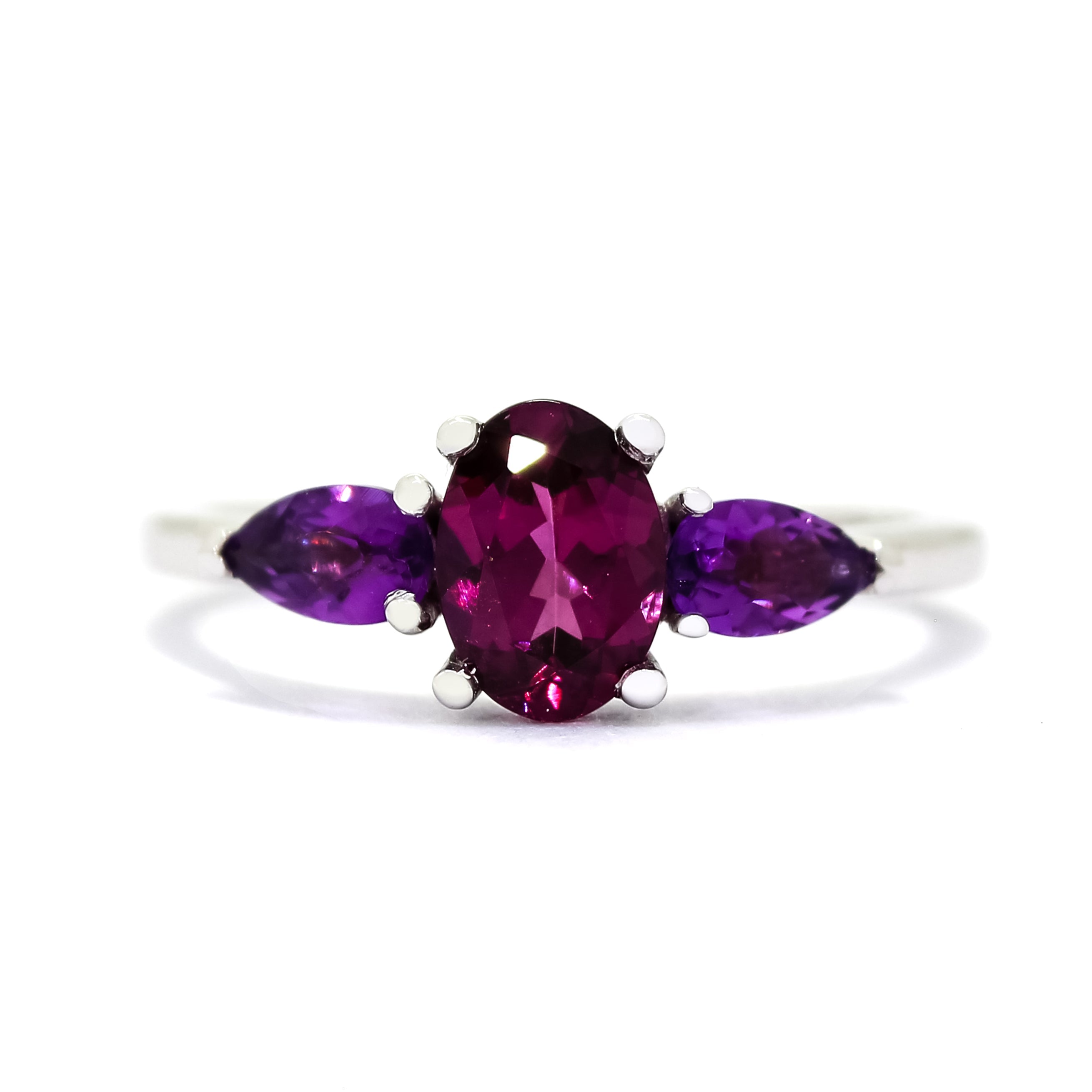 A lavish grape garnet ring in 9k white gold, hugged by two pear shaped amethyst stones.