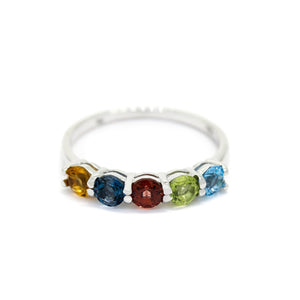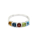 A stunning multi-jewelled ring made up of 5 4mm round-cut rainbow jewels - citrine, london blue topaz, garnet, peridot & blue topaz - for a playful and dazzling look.