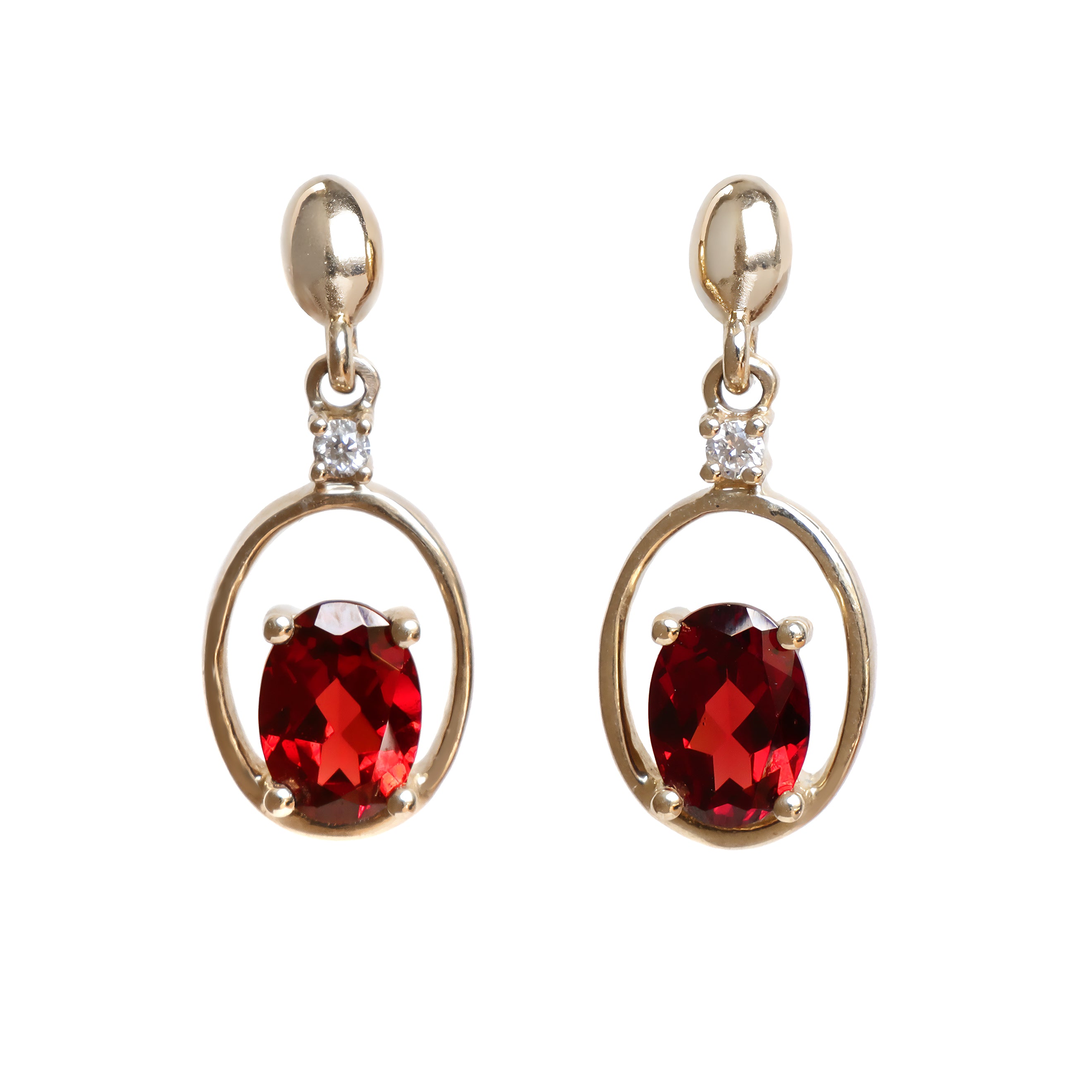 Feminine and bold yellow gold garnet earrings with diamond detailing.