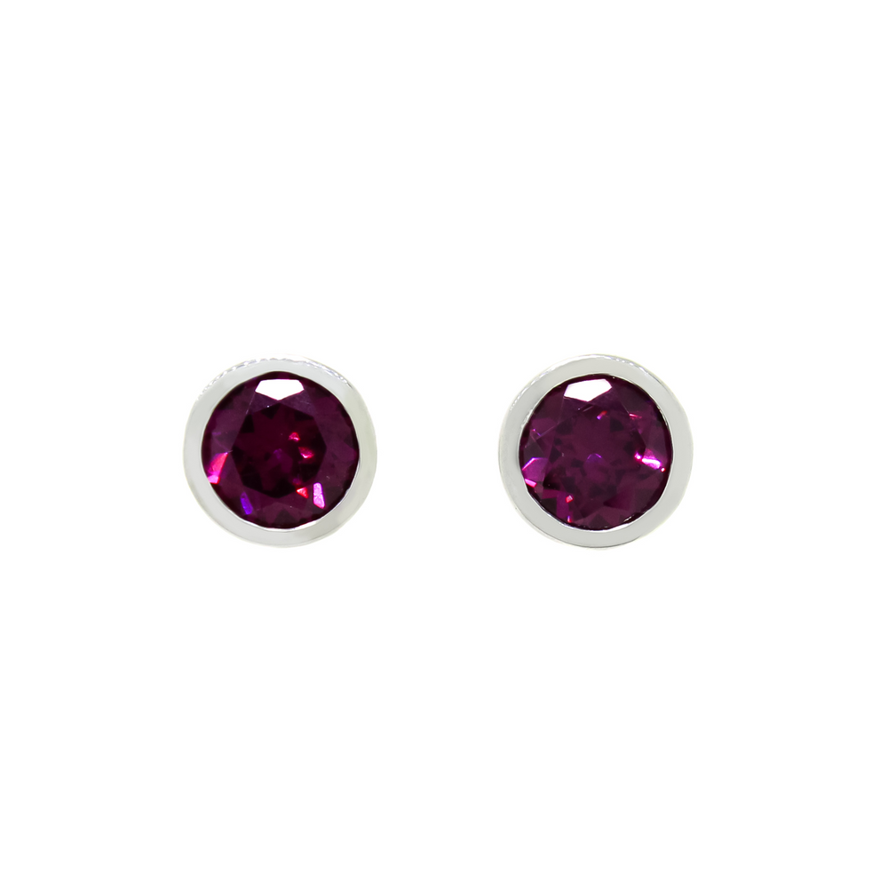 A simple and elegant pair of thick bezel-set grape garnet earring studs.