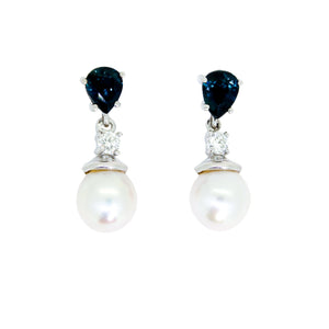 Elegant 6mm White Pearl drop earrings with 5x4mm Sapphires for a sophisticated look.