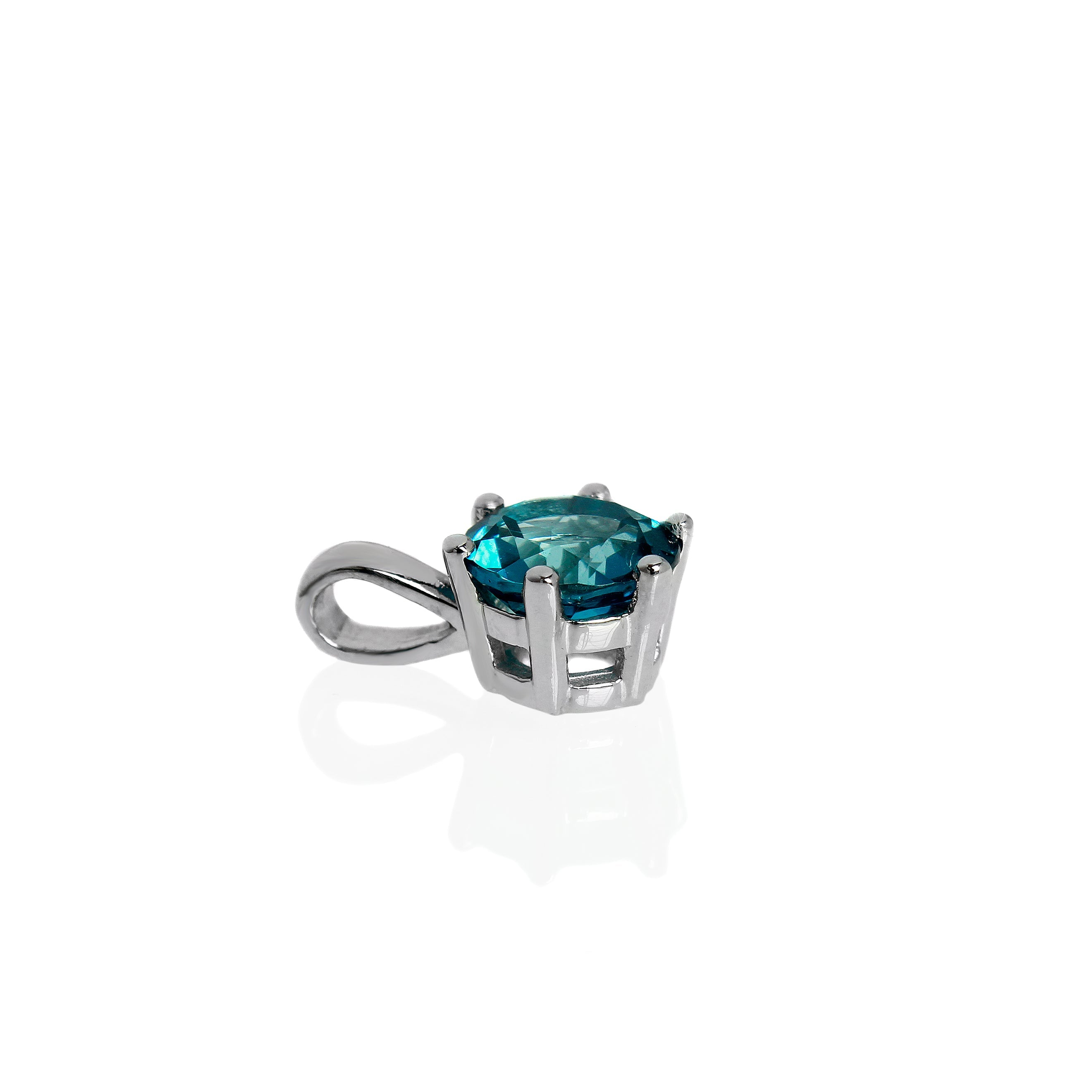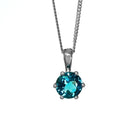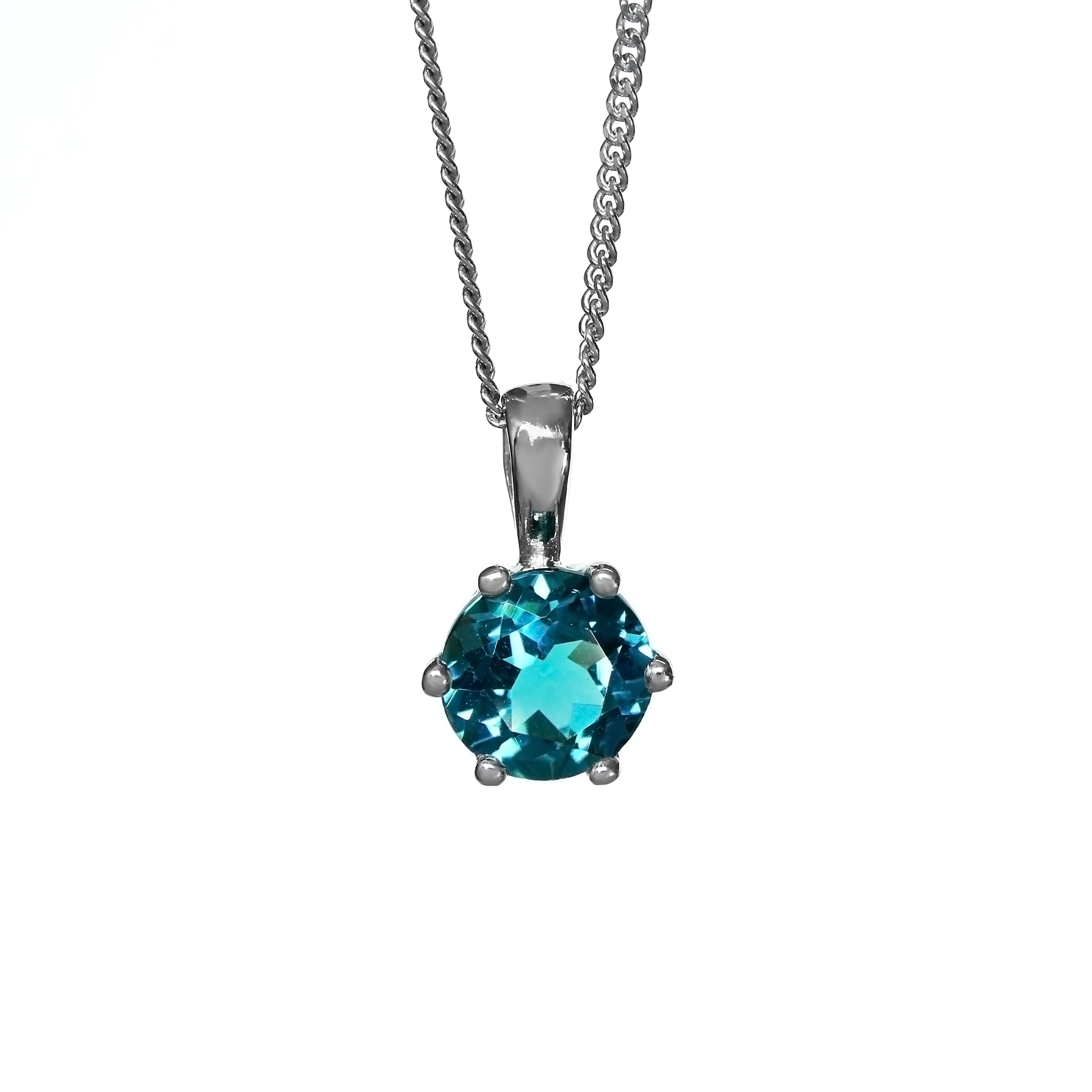 A dazzling 7mm round-cut London Blue topaz pendant framed by 6 sterling silver claws. Chain not included.