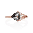 An asymmetric diamond-framed split-band ring in solid 9k rose gold, appropriate for any occasion. Perfect for lovers of the arts and the unconventional.