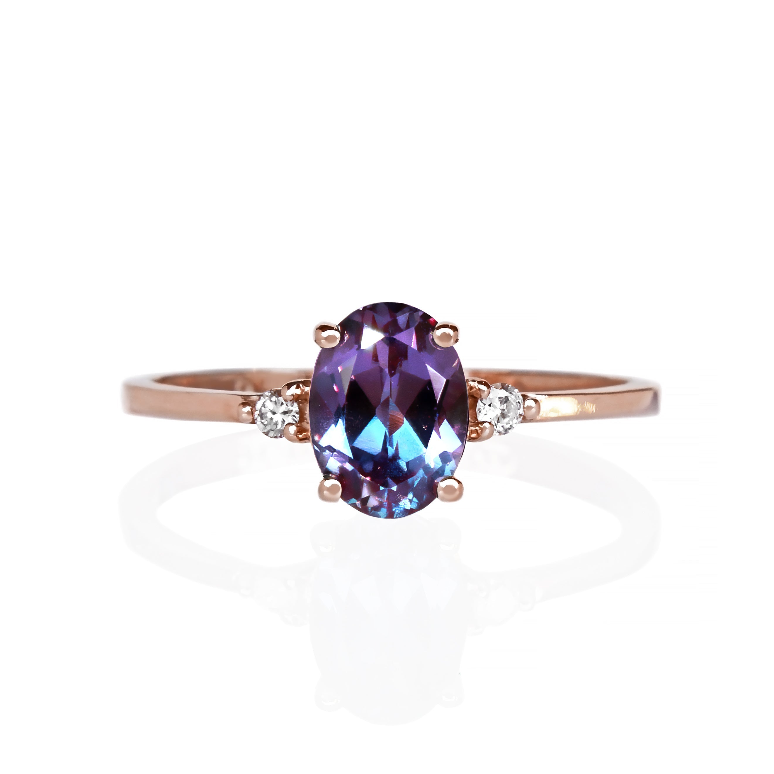 A dainty and elegant rose gold ring with a stunning trio of breathtaking 7x5mm colour-changing lab-created alexandrite and diamonds.