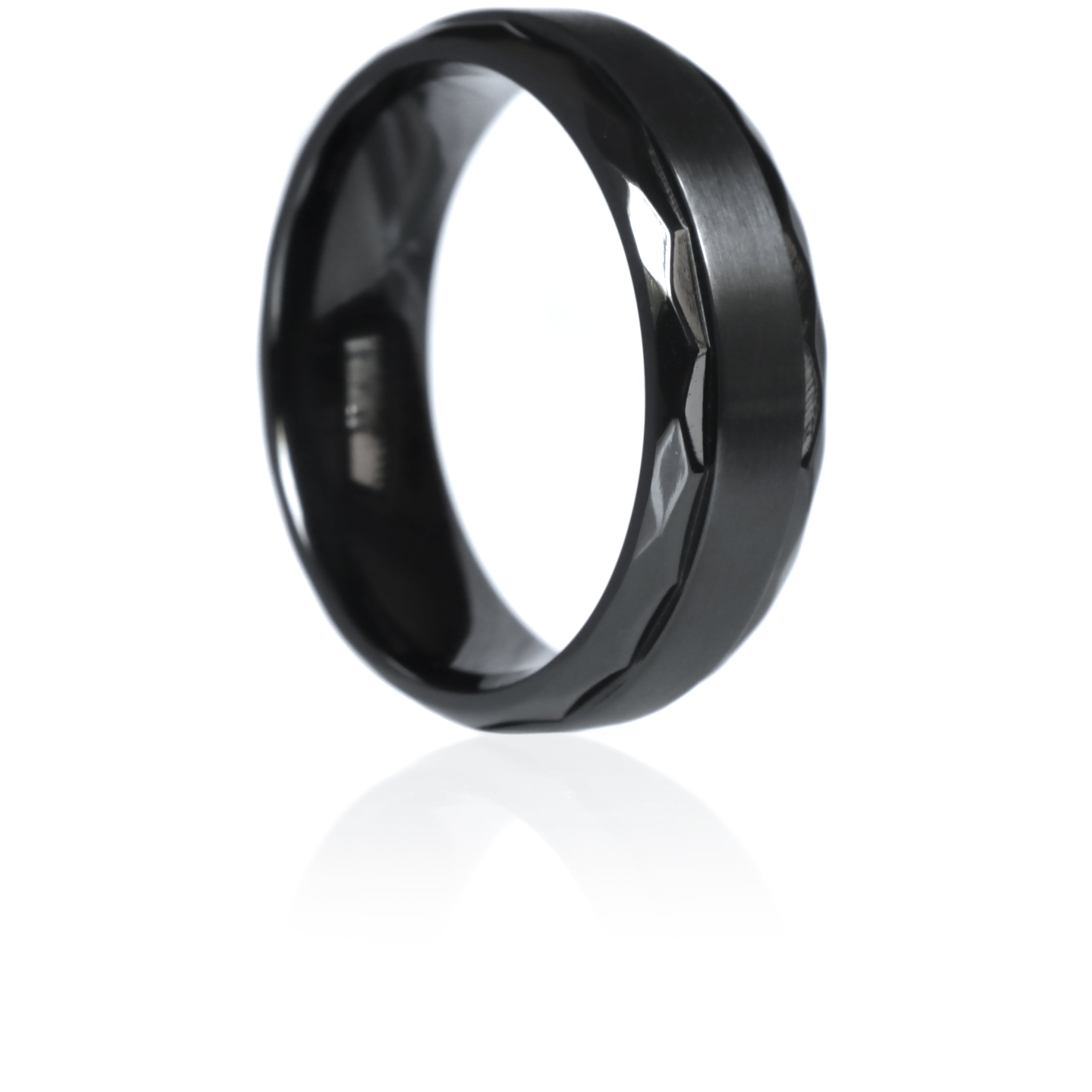 A captivating blend of modern design and enduring strength, this 8mm black zirconium ring showcases unique geometric pattern and a rich black finish. The striking contrast in textures make it the perfect statement ring or wedding band for those with a taste for the unusual.