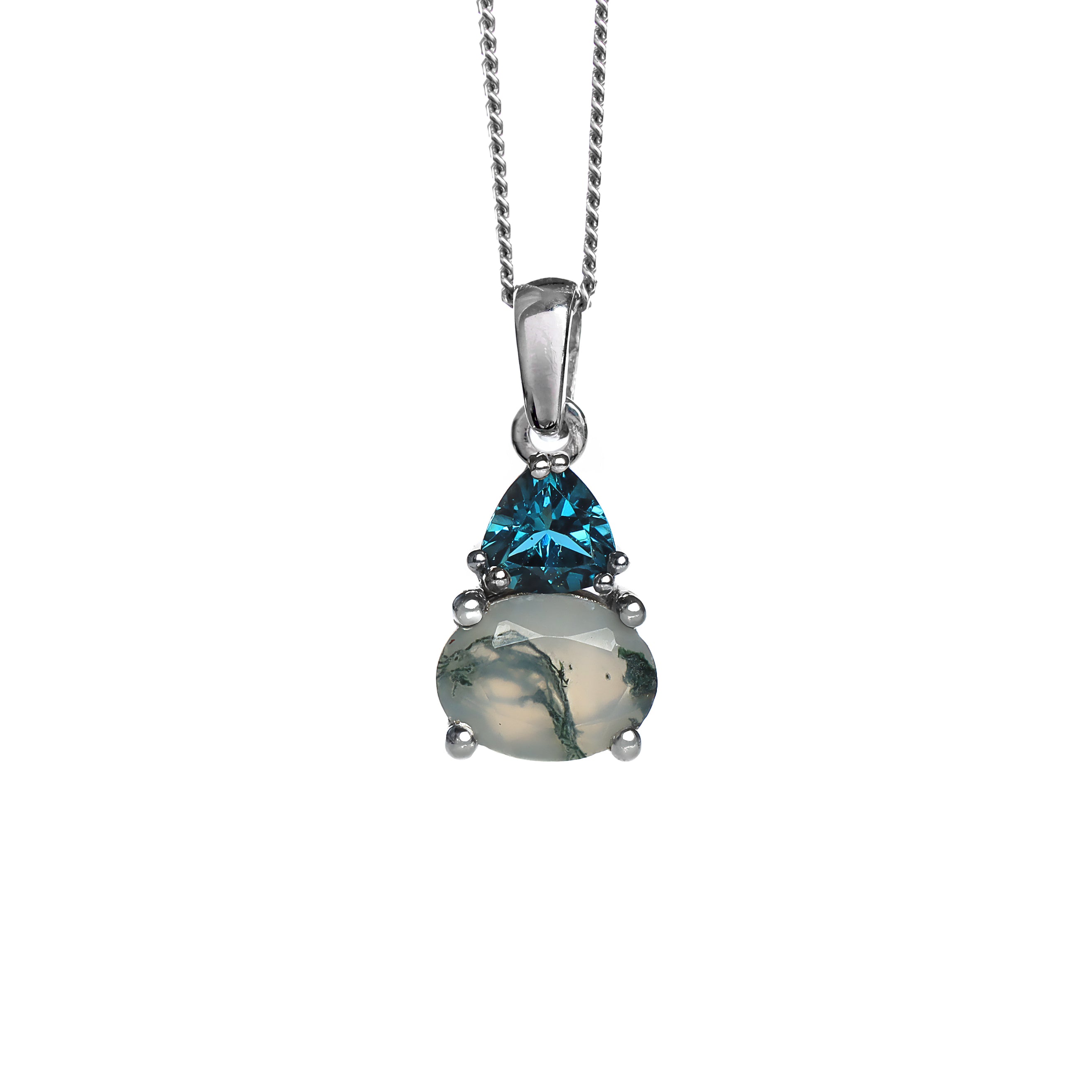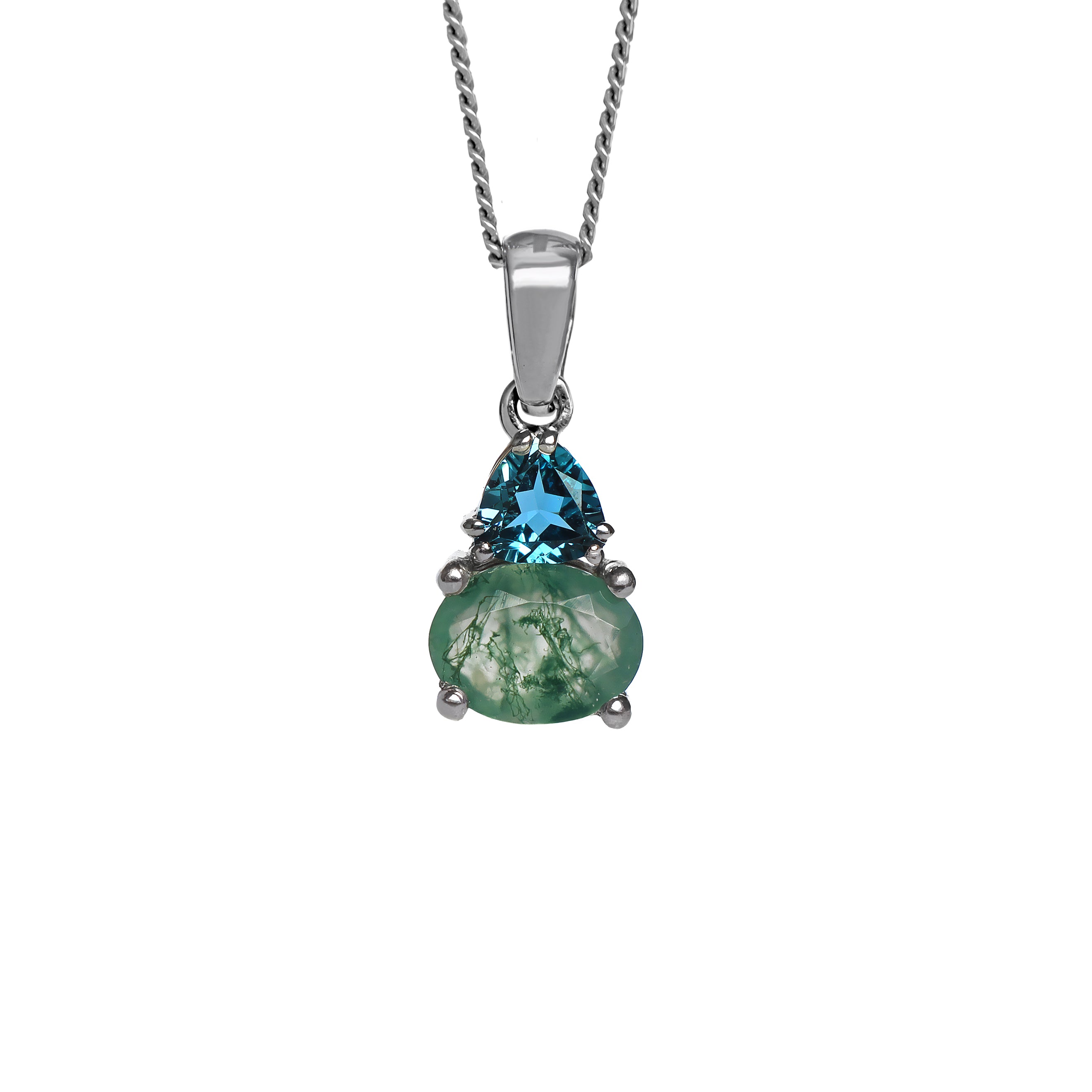 A chic and modern moss agate pendant with a bold 5mm trilliant London Blue Topaz detail. Chain not included.