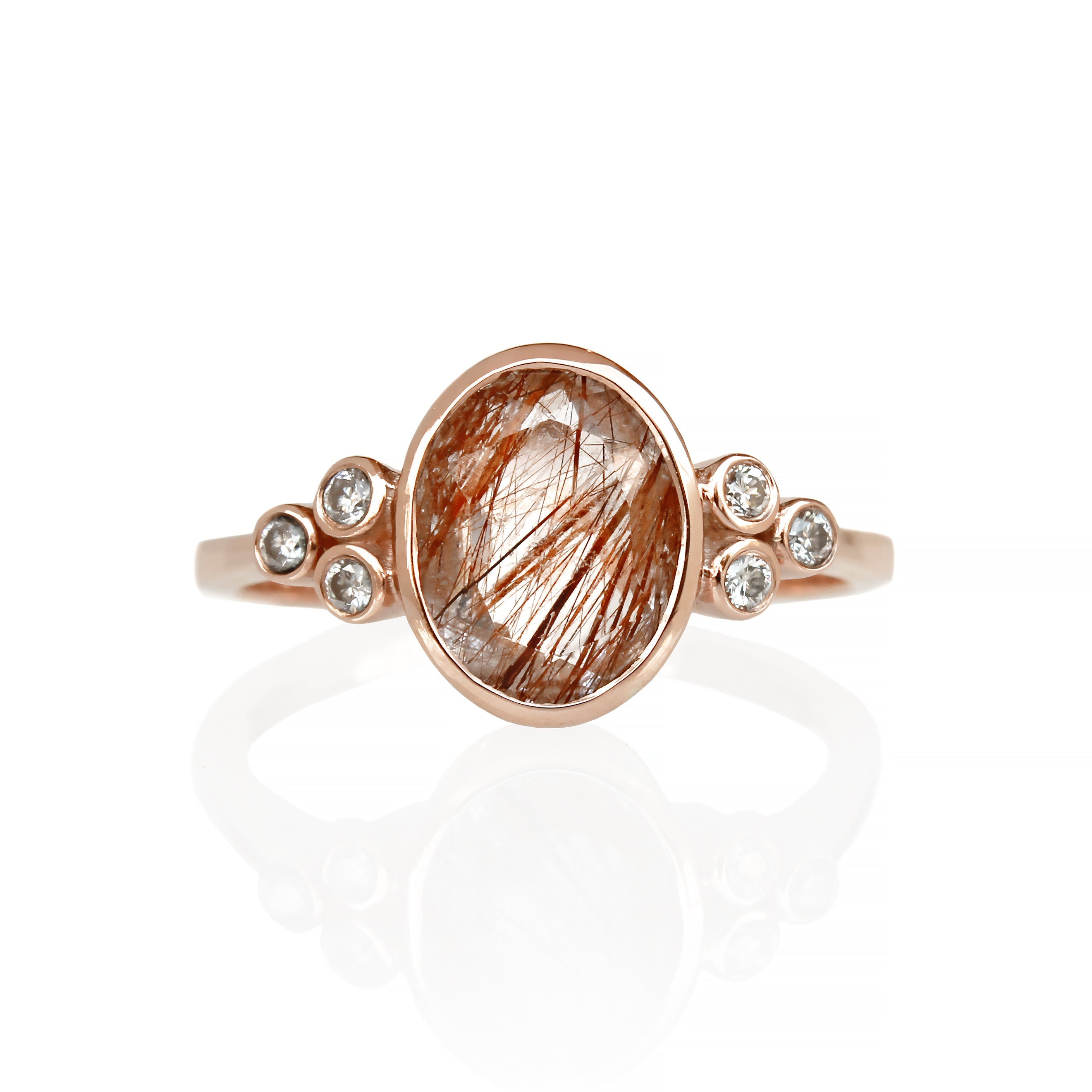 A lavish rose gold ring with trio diamond detailing and a stunningly unique copper-toned rutilated quartz centre stone, all embraced by delicate bezel-style settings, perfect for special occasions and engagements.