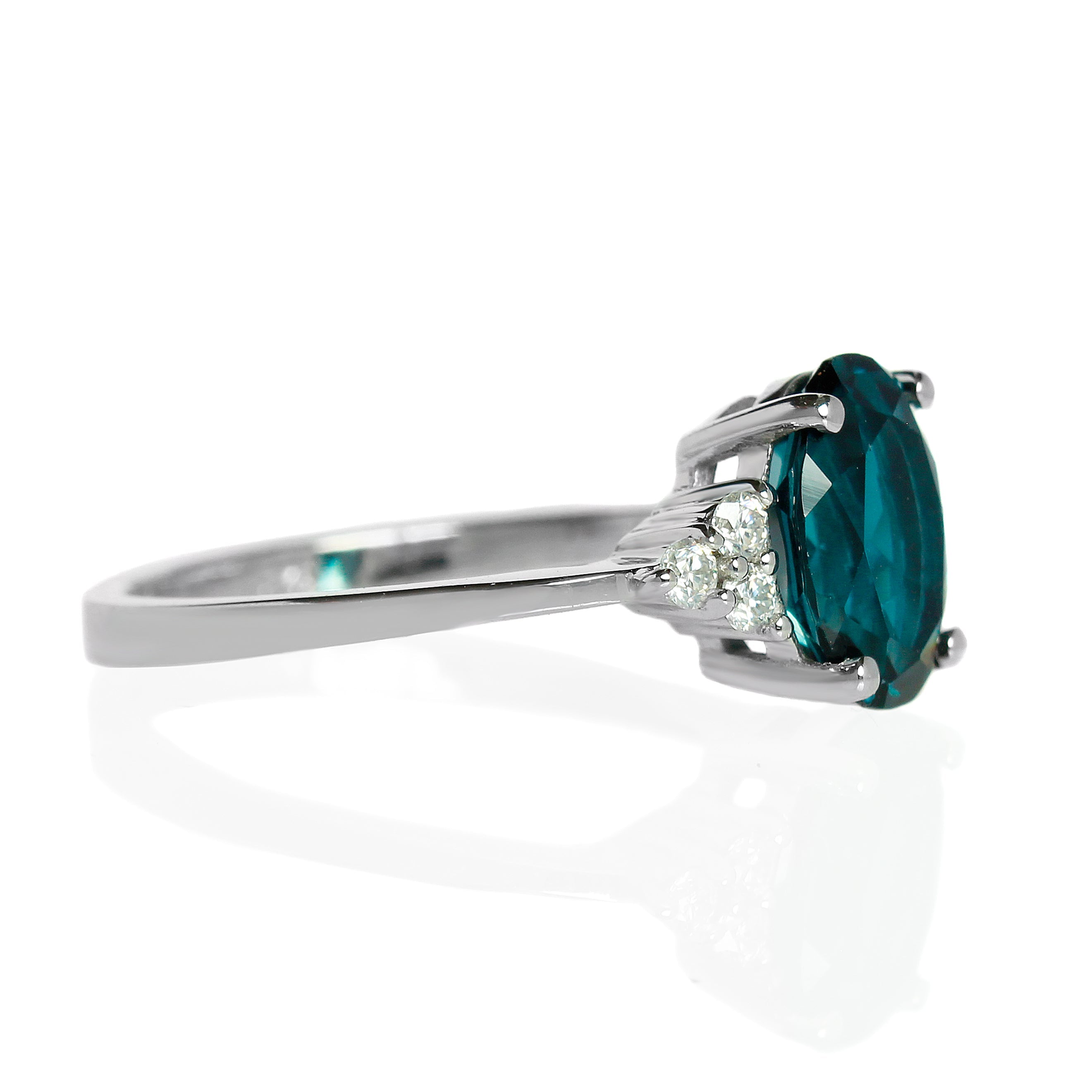 A lavish sterling silver ring with trio moissanite detailing and a stunning 9x7mm London Blue topaz centre stone, perfect for special occasions and engagements.