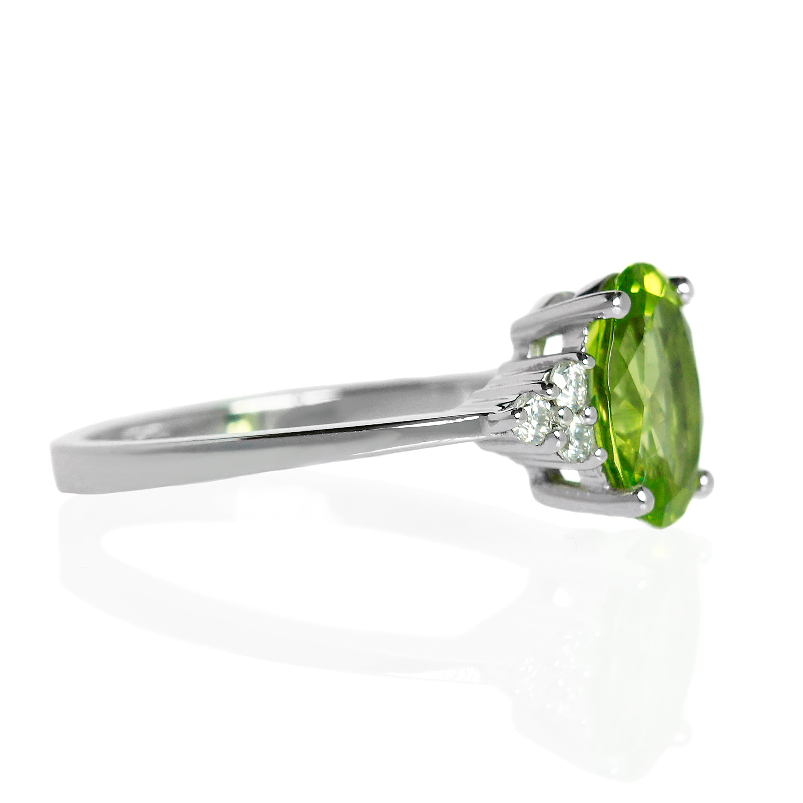 A lavish sterling silver ring with trio moissanite detailing and a stunning 9x7mm grass green peridot centre stone, perfect for special occasions and engagements.
