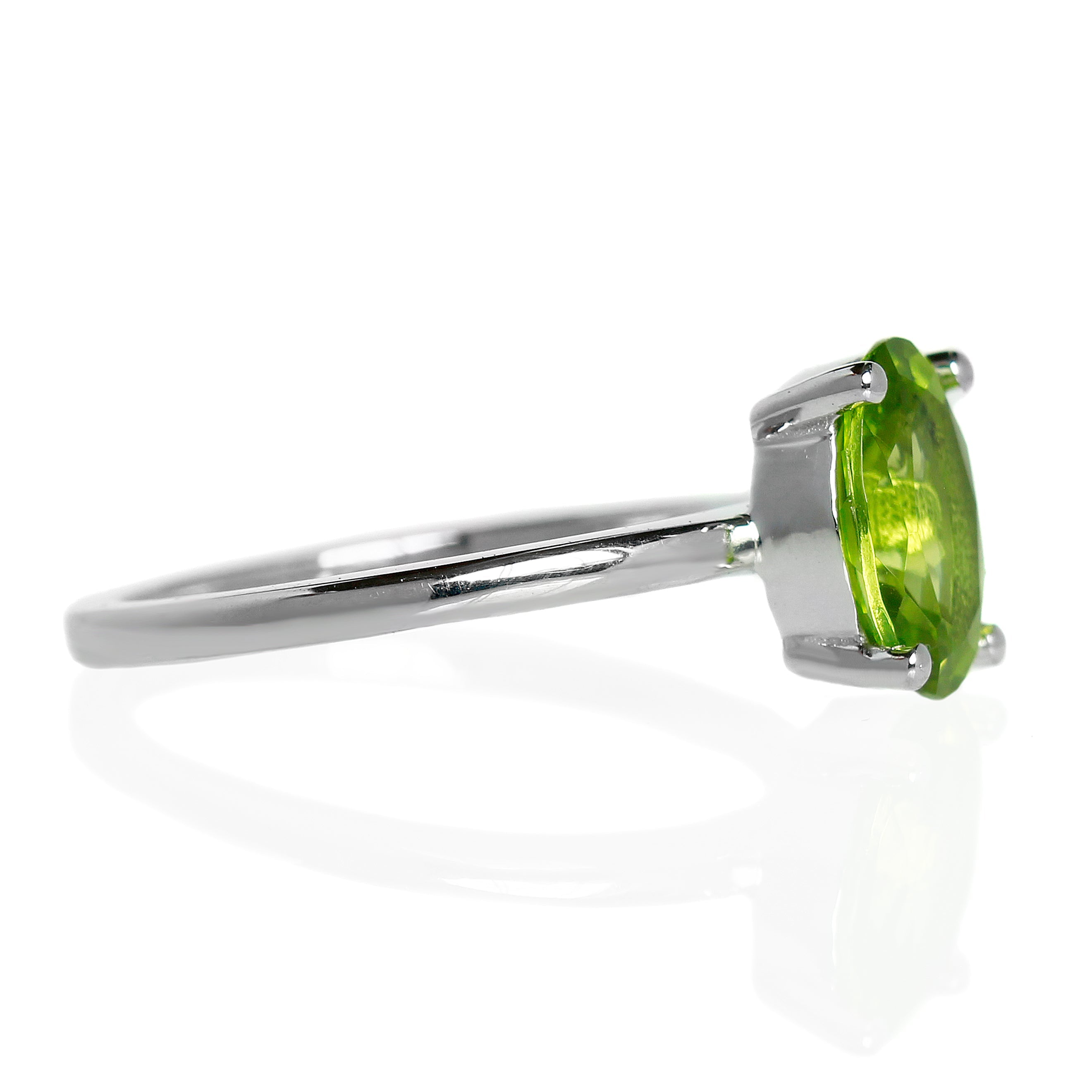 A staple silver solitaire ring, featuring a 9x7mm faceted oval peridot birthstone. Appropriate for every occasion.