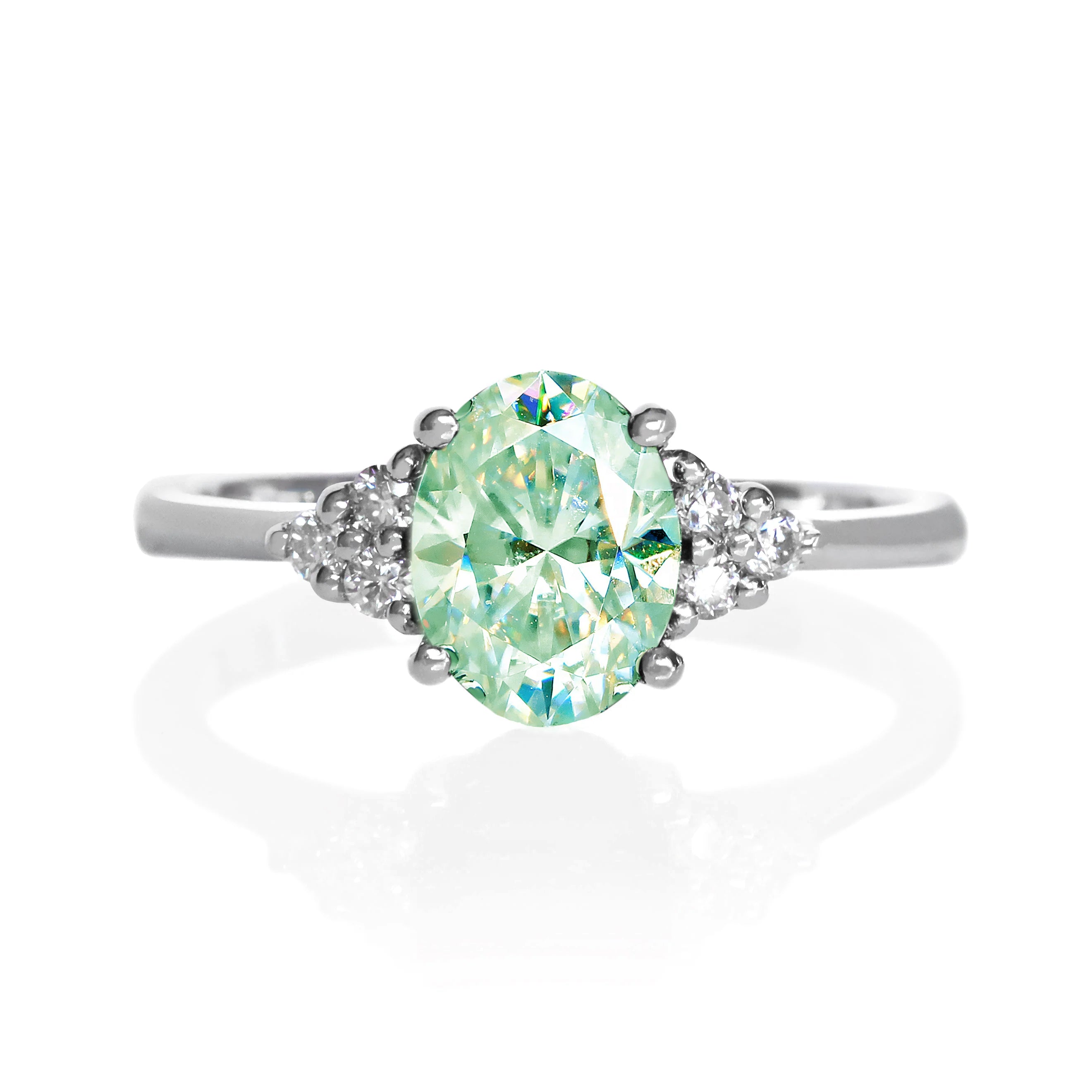 A lavish sterling silver ring with trio moissanite detailing and a custom-ordered green/teal dyed moissanite centre stone, perfect for special occasions and engagements.